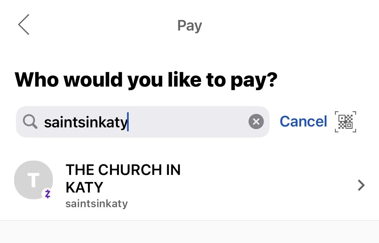 The church’s Zelle account is: saintsinkaty—this is what you will type into Zelle. The registered name is “THE CHURCH IN KATY” as the recipient. Review the picture on the right to see how it should look like.